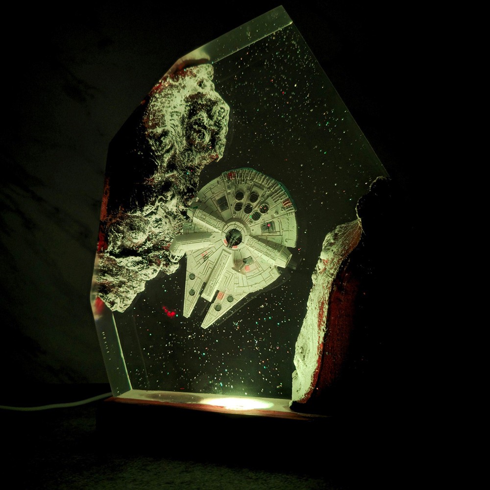 Weltraum-Galaxie-Nachtlicht aus Kunstharz und Holz, interstellare Epoxidlampe