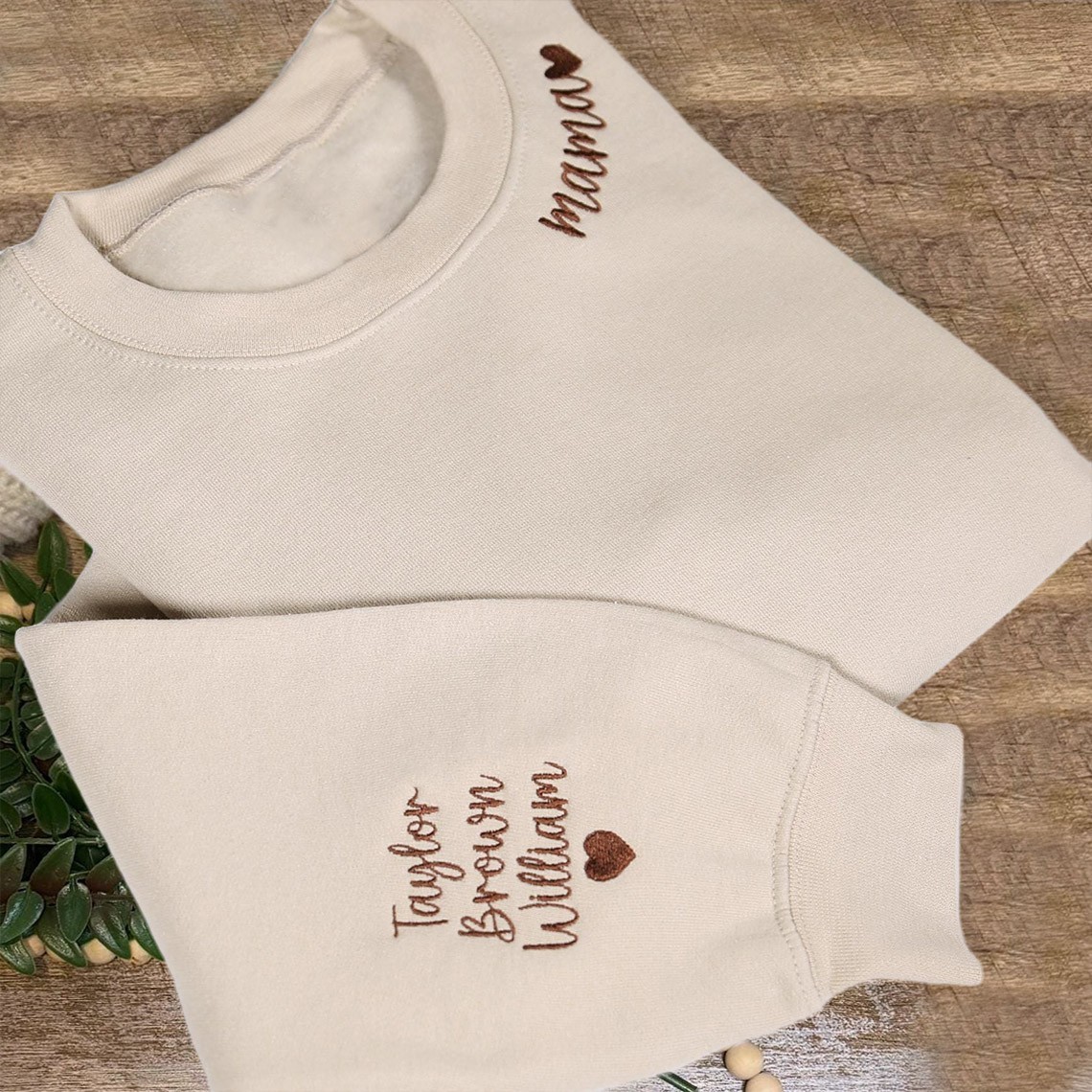 Custom embroidered mama sweatshirt. Personalized Mom Sweatshirt With Kids Names on the Sleeve. These make a great gift for mom, grandma gift, or new mom gift, or save them for a perfect Mother's Day, Christmas gift!