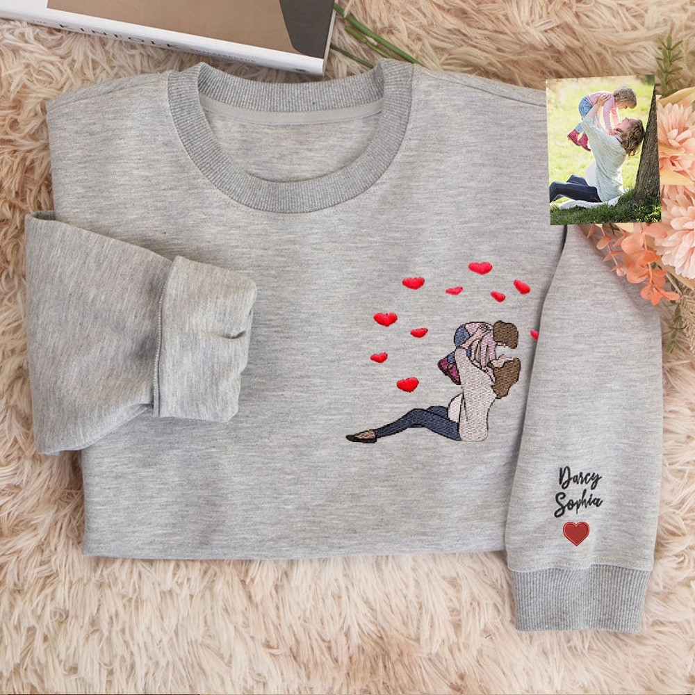 Embroidered Mom Portrait Photo Sweatshirt with Kids Names on Sleeve Custom Gifts for Mom Grandma Mother's Day Gift Ideas