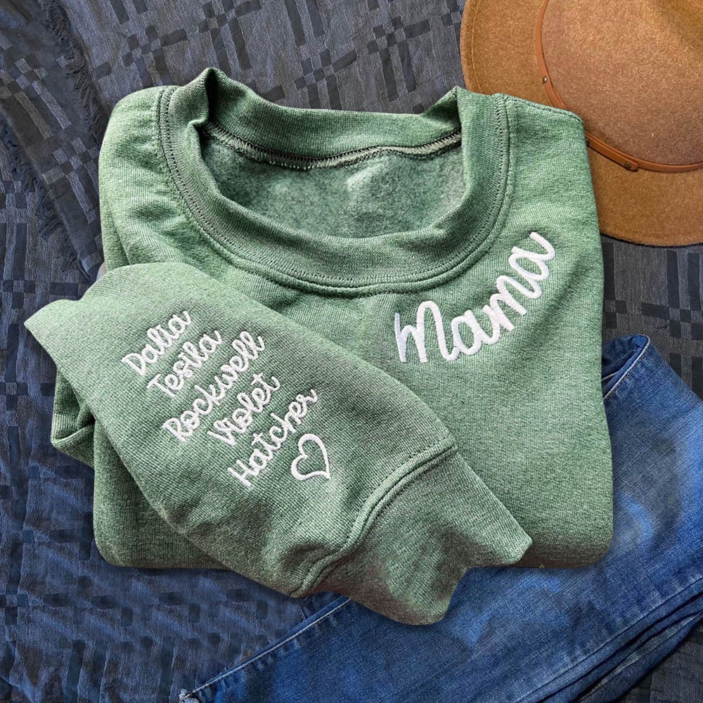 Celebrate the bond between Mom and her children with our Personalized Embroidered Mama Hoodie Sweatshirt, a heartfelt Mother's Day gift that adds a stylish and personal touch to her wardrobe.