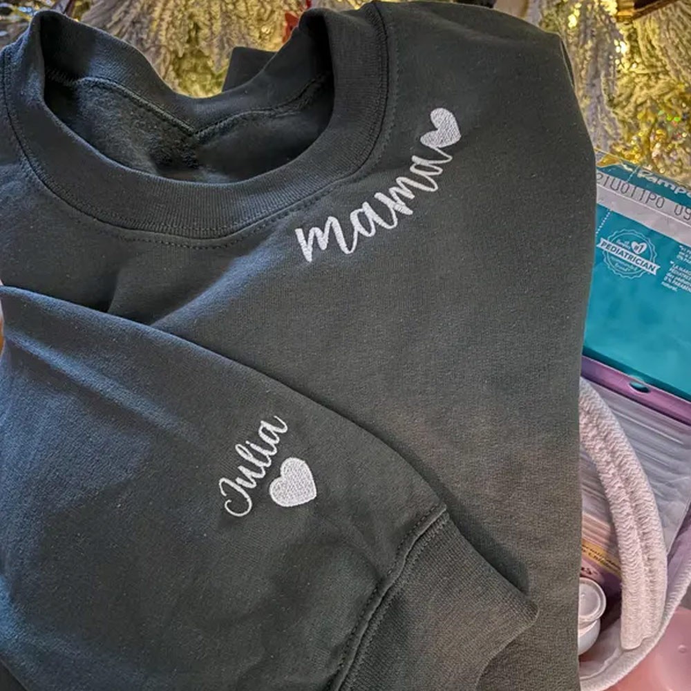Custom embroidered mama sweatshirt. Personalized Mom Sweatshirt With Kids Names on the Sleeve. These make a great gift for mom, grandma gift, or new mom gift, or save them for a perfect Mother's Day, Christmas gift!