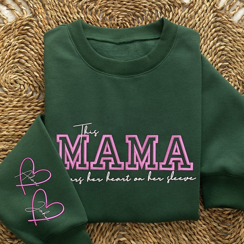 Personalized This Mama Wears Her Heart on Her Sleeve Sweatshirt with Kids Names on Sleeve Gifts for Mom Mother's Day Gift