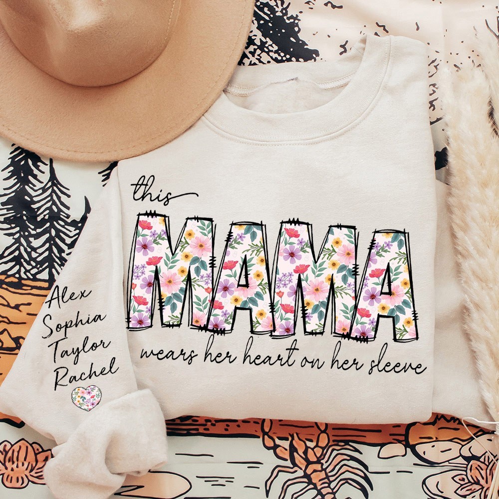 Custom This Mama Wears Her Heart on Her Sleeve Sweatshirt with Kids Names on Sleeve Gifts for Mom Mother's Day Gift Ideas