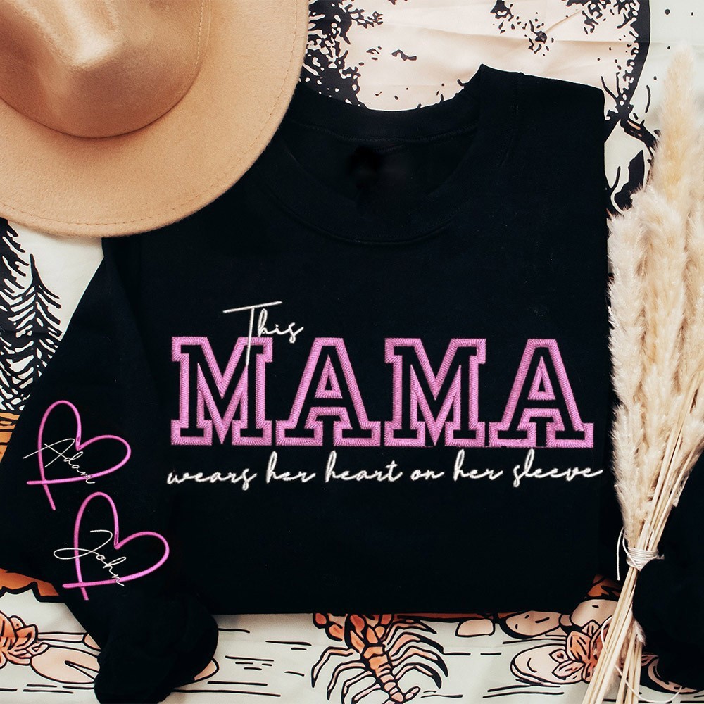 Personalized This Mama Wears Her Heart on Her Sleeve Sweatshirt with Kids Names on Sleeve Gifts for Mom Mother's Day Gift