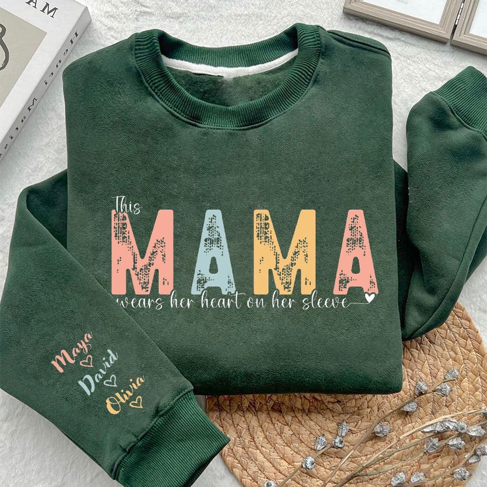 Custom This Mama Wears Her Heart on Her Sleeve Sweatshirt with Kids Names on Sleeve Gifts for Mother's Day New Mom Gift