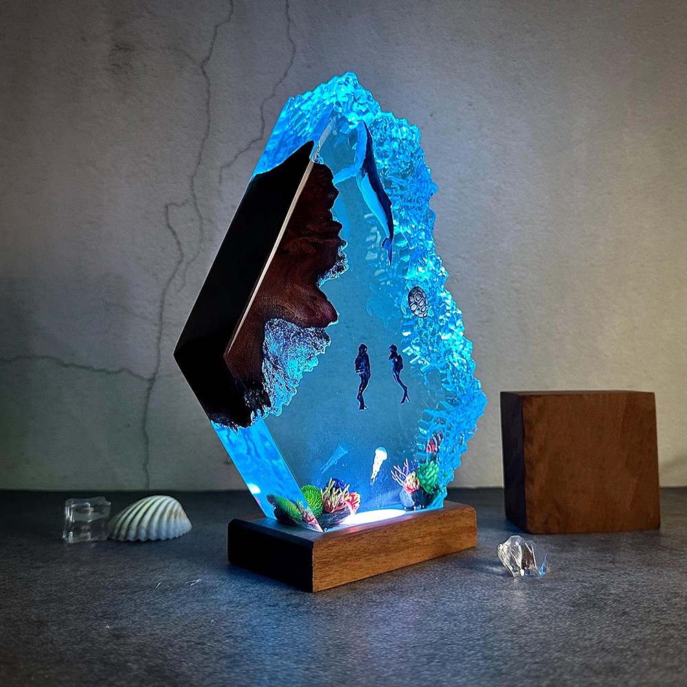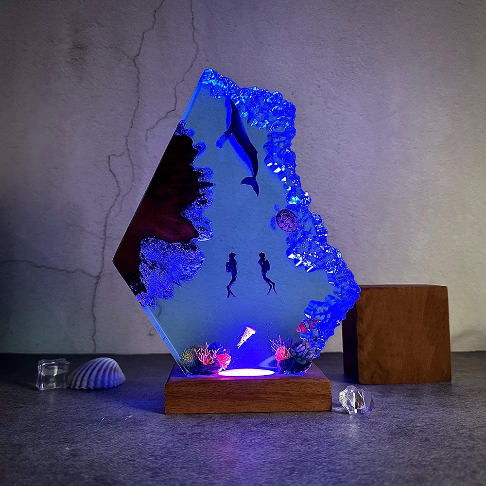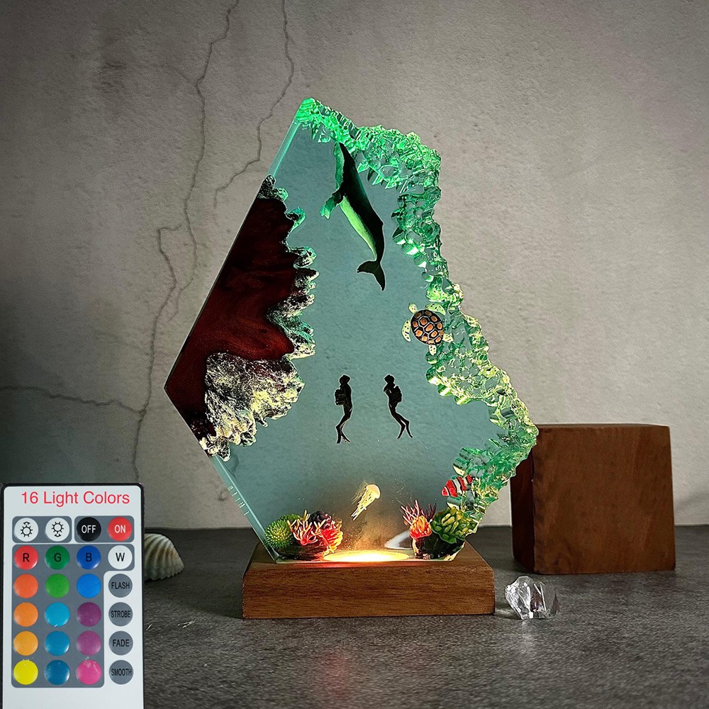 Lámpara de madera de ballena y pareja de bucle, lámpara de océano de resina epoxi, mar azul profundo, medusas y nemo, luz nocturna personalizada, regalo de Navidad